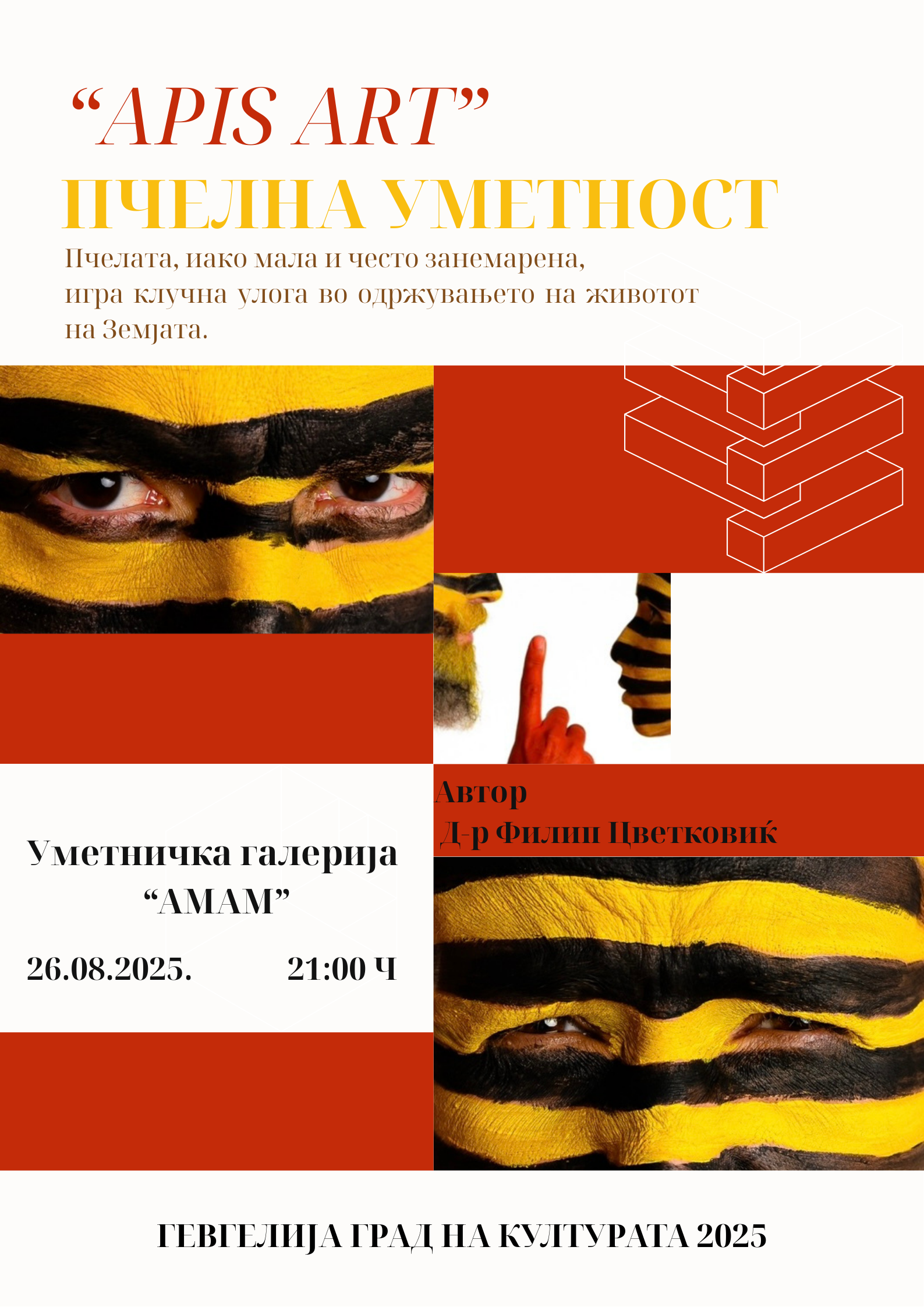 Во рамките на програмата на Престолнина на културата за 2025 година, градот Гевгелија ќе биде домаќин на свеченото отворање на изложбата „Апис Арт – Пчелна уметност“, чиј автор е доц. д-р Филип Цветковиќ. Отворањето на изложбата е закажано за вторник, 26 август 2025 година, со почеток во 21.00 часот, во просториите на Уметничката галерија „Амам“ во Гевгелија.